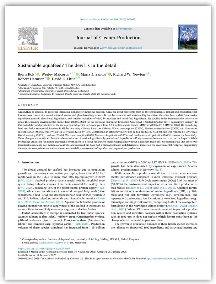 In a new study led by Björn Kok and Dr Wesley Malcorps, the impact on environmental footprint of changes in diet composition of European aquaculture species was investigated between 2000 and 2020. Over this period there was a dramatic reduction in the inclusion of marine ingredients and a corresponding increase in the use of terrestrial ingredients, especially plant-based.