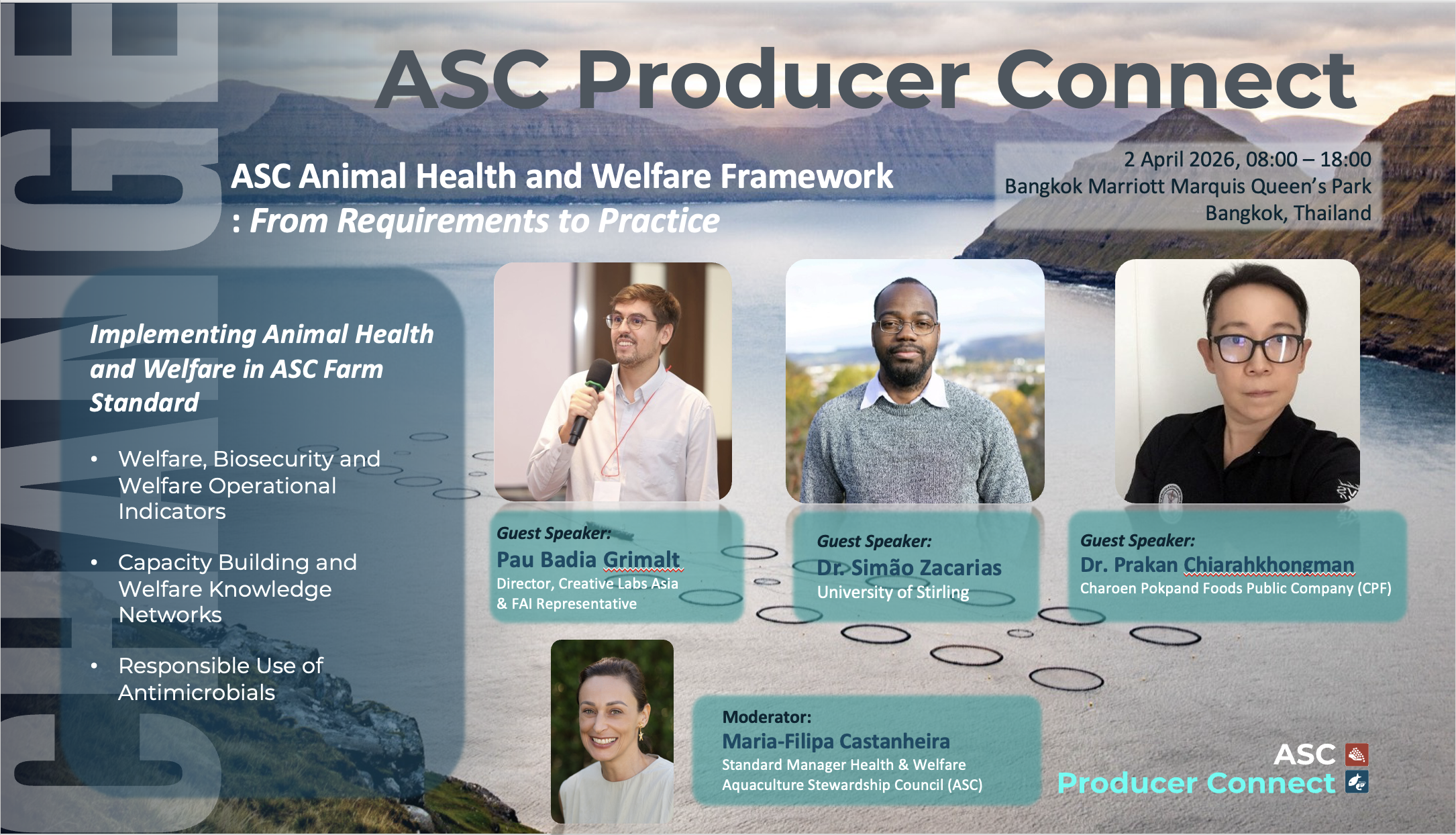 Dr Simao Zacarias will be presenting the Asian Fish Welfare Network at the ASC Producer Connect event at Bangkok Marriot Marquis Queen’s Park on 2nd April 2026.