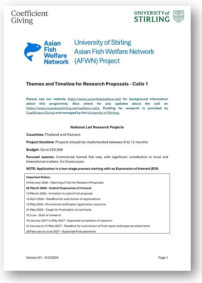 Academic or research organisations based in one of these countries are invited to submit expressions of interest to lead collaborative research projects lasting between six and twelve months with funding up to GBP 20,000 from Coefficient Giving through the Asian Fish Welfare Network project, managed by the University of Stirling. Feedback will be provided and eligible applicants will be invited to develop a full proposal for independent evaluation and selection.