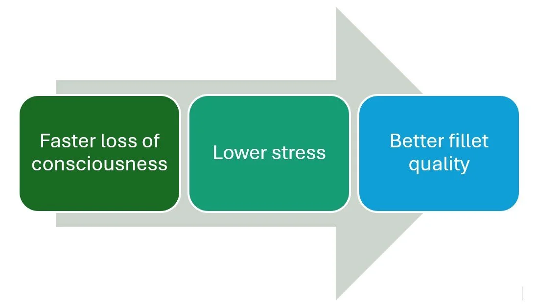 At the other end of the spectrum, asphyxiation performed worst causing prolonged distress, high stress biomarkers, rapid rigor mortis and noticeably poorer fillet quality. Live freezing and priest stunning looked acceptable behaviourally, but didn’t actually reduce physiological stress or improve flesh quality. Ikijime showed potential, but depended heavily on operator skill. The study confirmed the simple but powerful link: