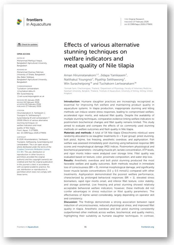 You can access the full publication here: Hirunratanakorn, A., Yamkasem, J., Youngnoi, N., Setthawong, P., Surachetpong, W., & Lertwanakarn, T. (2026). Effects of various alternative stunning techniques on welfare indicators and meat quality of Nile tilapia. Frontiers in Aquaculture, 5. https://doi.org/10.3389/faquc.2026.1779691